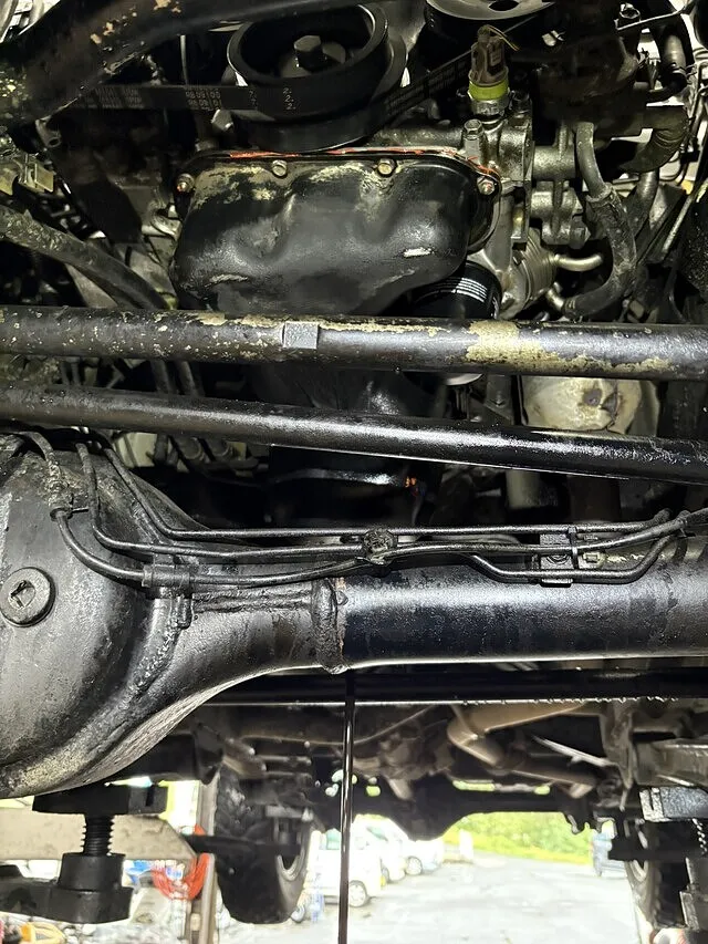 早速チェックをしたところ、エンジン下部のいたるところからオイル漏れがありました。